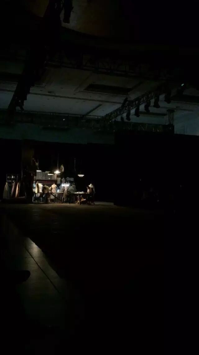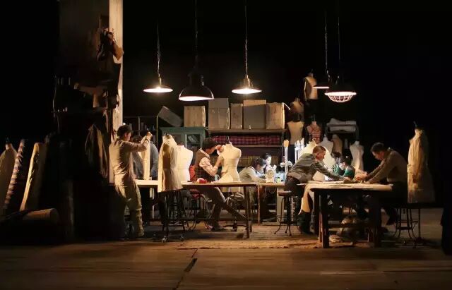 随着大幅帷幕徐徐拉开,在舞台远处呈现老服装工作间的情景。