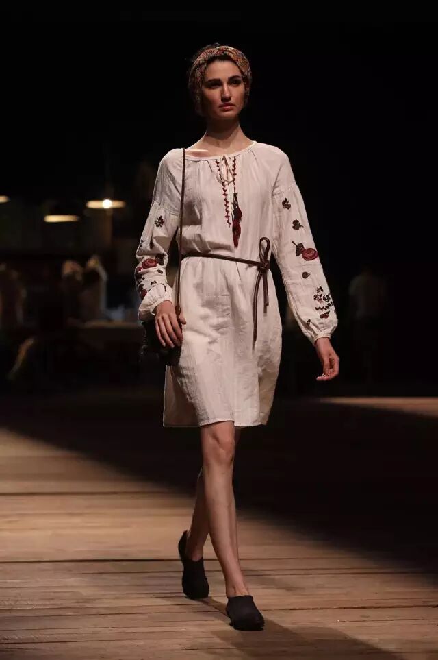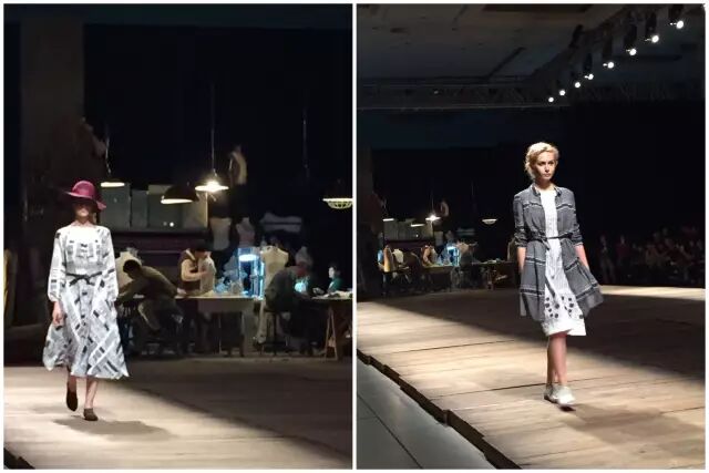 这时,灯光由远至近亮起,模特在铺着枕木的舞台上走来。我们这次看的是