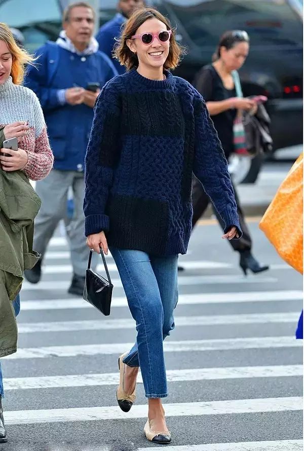 穿大号毛衣时,建议下半身选择紧身、款式精简的单品,即便身材不完美也难出错,选择精致、小巧的鞋子和手袋,放大对比效果更显瘦▼