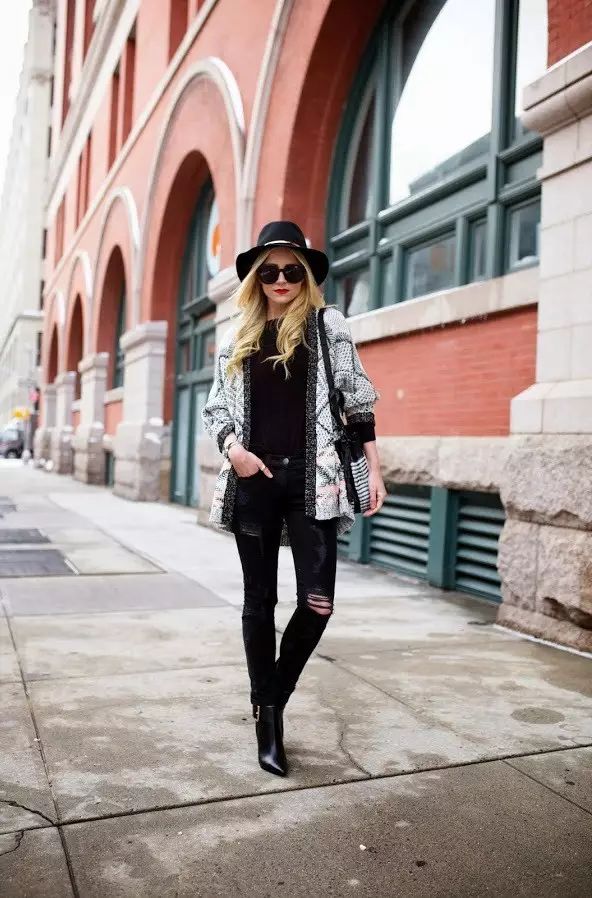 舒适的针织开衫搭配纯黑色打底上衣与撕裂牛仔裤,宽檐帽与抛光的尖头高跟鞋共同塑造这一个精致的look▼