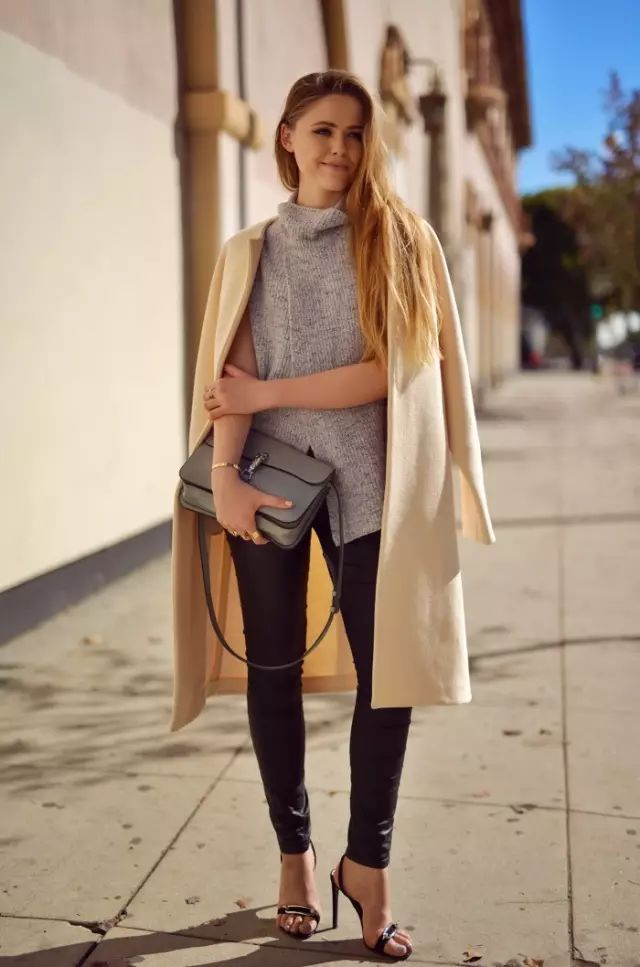 简约而优雅的外套搭配别致设计的高领灰色毛衣,搭配黑色紧身皮革库、结构化包包以及简约高跟鞋,整个look看起来优雅别致▼