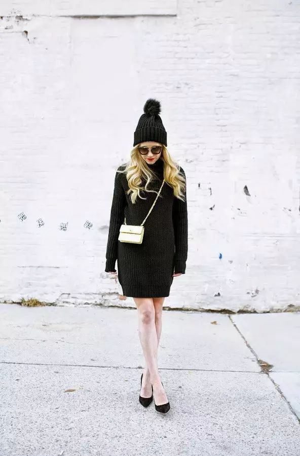 完全黑色的精致外观,皮草绒球的针织帽、长袖的针织裙与黑色尖头平底鞋▼