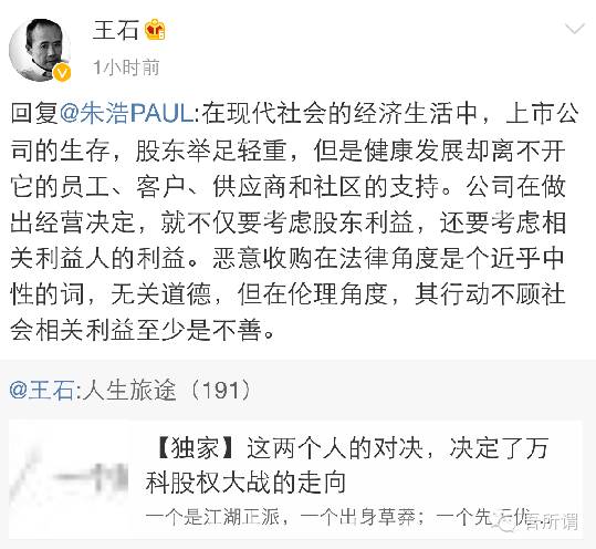 上星期在北京万科会议中万科的大佬王石声明:“不欢迎宝能系作为第一大股东。”并且说“下星期一见!”顿时,全国上下都炒得沸沸扬扬。在商场上不是没有绝对的敌人吗?为何王大佬要如此“冲动”将姚老板拒之门外?是姚老板“无信用?弱能力?风险大?毁品牌?”咳~周一见,蒲大倒是想跟大家讲讲从这两位衣Q看IQ,到底是哪位更胜一筹?正所谓衣品见人品,不知道这句话可否当真,但大家可以一同和蒲大验证下:哈哈~~~先说一下此次事件先发制人的——王石,万科创始人,按万科今天市值计全球福布斯手到擒来,名利兼得无可厚非,难怪极度个人英雄主义膨胀。宝能系的姚老板其实也没不按按法律章程走,却被打击成“野蛮人”。