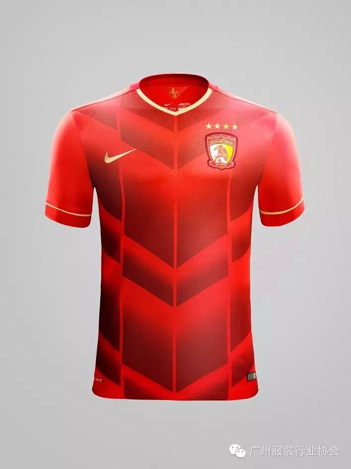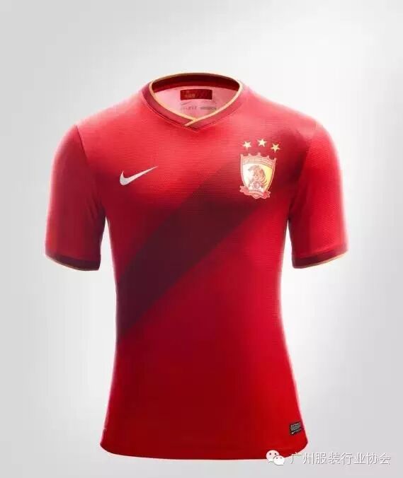 2014赛季 球衣继续沿用了动感、热情的红色主色调设计,而无论是华南虎元素的巧妙融入,还是象征球队王者风范的勋带条纹都体现了耐克在设计上的独具匠心。球衣正面斜向而下的暗红色条纹灵感汲取自胜利者接受加冕时的勋带,位于衣领内侧领标上的“广州未赢够”字样,彰显广州雄心。整件球衣最为醒目的就是队徽上方的三颗代表中超冠军的金星。