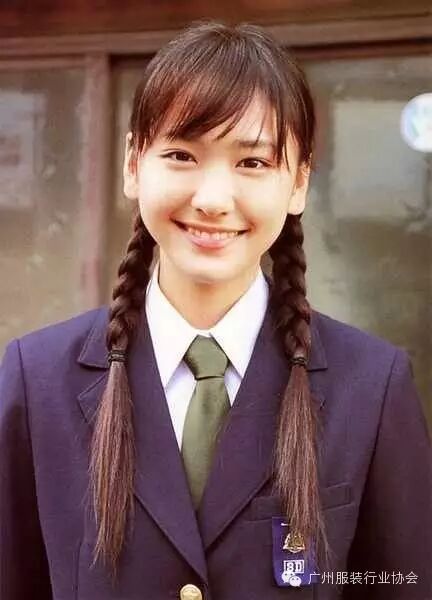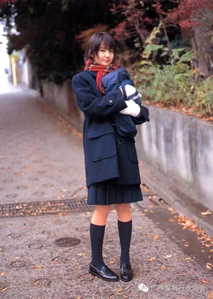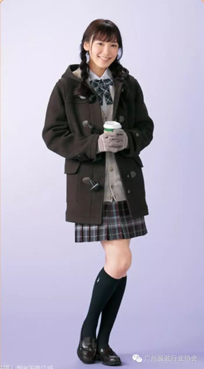 双排扣大衣+开衫毛衣+长袖衬衣+百折短裙+黑色或白色长袜+学生平底鞋=冬季校服。