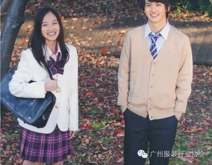 小西装+开衫毛衣或背心毛衣+长袖衬衣+百折短裙+领带或蝴蝶领结+黑色或白色长袜+学生平底鞋=秋季校服。