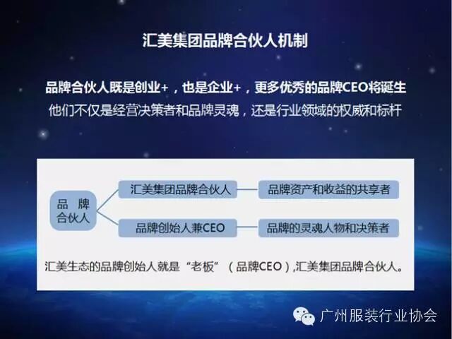 方建华表示,汇美生态的品牌创始人就是“老板”,品牌的CEO。而他作为集团创始人则是汇美生态规划的首席架构师、品牌决策和战略参谋顾问。成为真正意义上位居二线的导师,从以前拉着团队前进,转变为在二线谋划和主导商业模式变革。他的使命就是“成就更多的卓越品牌创始人和集团品牌合伙人”。汇美生态系统里面,“品牌合伙人”既是创业+,也是企业+,这里将诞生很多优秀的CEO,他们不仅是经营决策者和品牌灵魂,同时还是行业领域的权威和标杆。