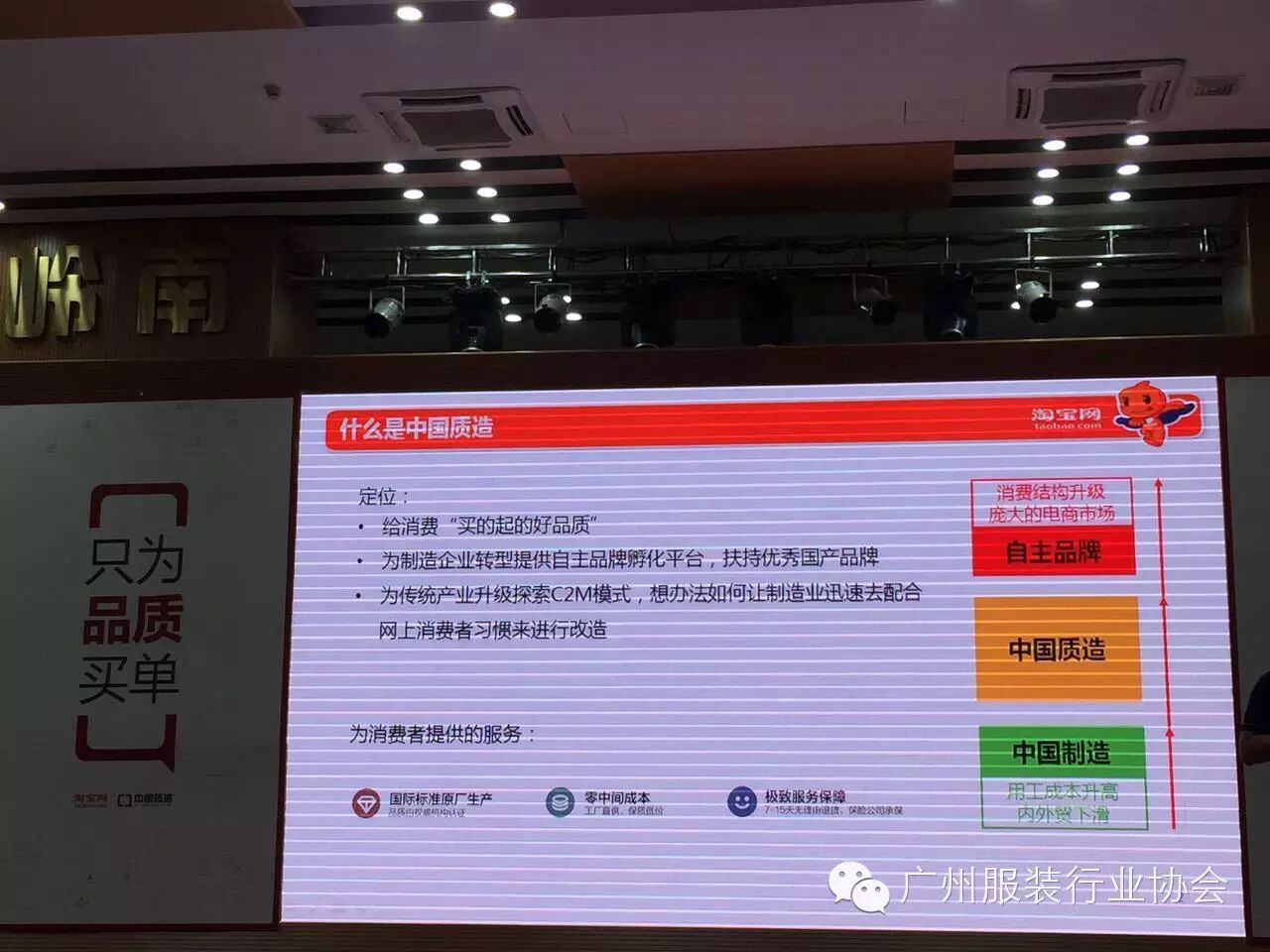 由淘宝网主办,广东省电子商务商会承办,广州服装行业协会协办的“淘宝网--中国质造实力企业见面会”于2015年8月6日在岭南国际电子商务产业园隆重举行。本次活动以“中国质造”为主题,邀请国内主流电商企业参加,重点探讨如何为制造企业转型提供自主品牌孵化平台,扶持优秀国产品牌,同时为传统产业升级探索C2M模式,想办法让制造业迅速配合网上消费者习惯来进行改造。