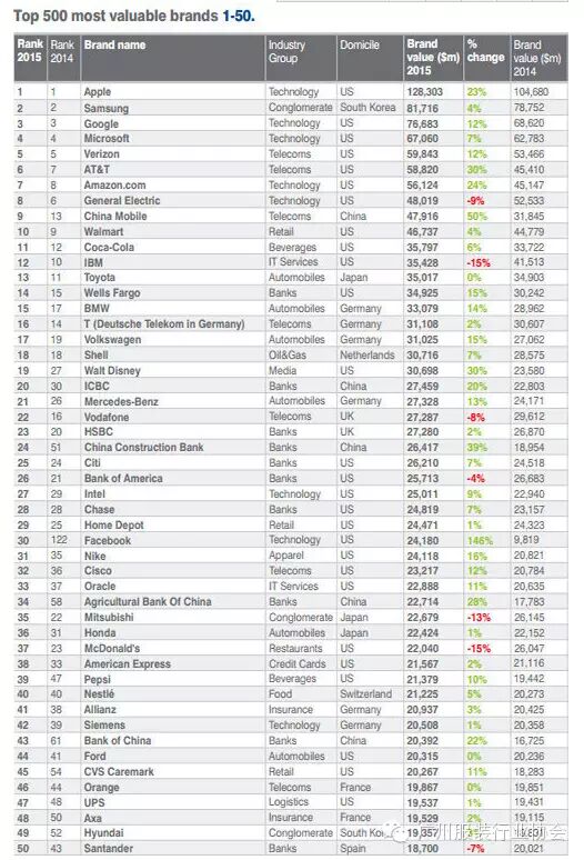 Brand Finance近日公布全球价值最高的品牌排行榜。名列2015年度的Global 500排行榜的有亚马逊(第7位),Facebook(30),耐克(31)和宜家(51)等行业巨头。中国电商巨头阿里巴巴则直接跻身第107位。