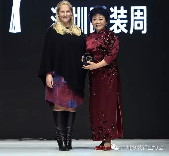 组委会代表、深圳市服装行业协会会长沈永芳与IMG国际管理集团高级副总裁凯瑟琳·班尼特交换礼物