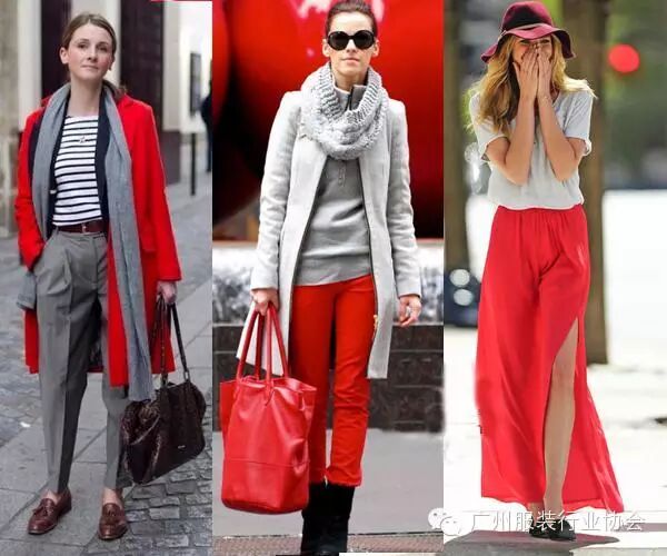 不同于红色与黑色、白色搭配显示出强烈感,明亮的大红色碰撞上介于黑白间的灰色会将整个人柔化,变得不那么锋芒毕露。尤其是秋冬的时候灰色的毛呢外套搭配上红色的连衣裙既不会让人觉得很沉闷也不会过于高调。