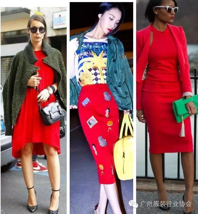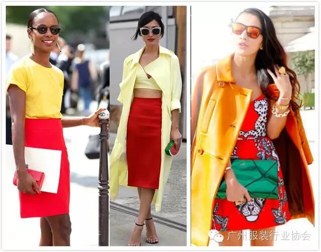 热情的红色搭配上亮眼的黄色,夺目感和记忆感就是这两种单色的两倍。真的是会令见到的人在视觉上更为直接的受到冲击,脑海里也会留下比较深的记忆。这样比较夺目的配色夏季搭配起来会更好,这两种色系的搭配侵略性较强,而秋冬时一款红色的连衣裙搭配姜黄色连衣裙或者亮黄色单肩包都会让你成为人群中的闪光点。同时下面图片中的第三幅我们可以看出红色的连衣裙搭配深绿色的手拿包也是很吸睛的。