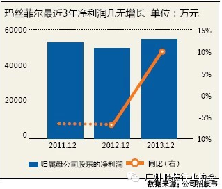 6月27日,玛丝菲尔在证监会网站公布了其首次公开发行股票的招股说明书(以下简称“招股书”)。招股书内容显示,2011年~2013年间,玛丝菲尔的营业收入由14.03亿元增长至18.49亿元,年均复合增长率达14.78%;但同期其净利润增长几乎停滞,2011年~2013年,玛丝菲尔的净利润分别为5.43亿元、5.10亿元和5.62亿元,年均复合增长率仅为1.72%,2012年公司的净利润同比增速甚至出现下降。