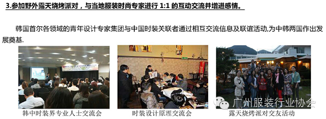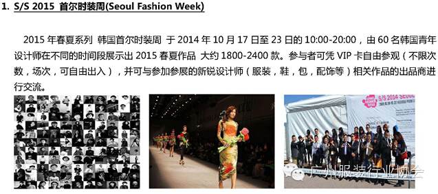 与纽约、伦敦、巴黎、东京等五大世界级时装周共同成长的“韩国首尔时装周”由 60名具有代表性的韩国青年设计师来展开激烈的时尚竞技,并将 2015春夏时装系列的潮流元素、色彩、风格等来展现出品牌价值。韩国服装纺织协会上海代表处与韩国时尚人才开发院上海中心,携中国专家团队亲临韩国首尔,感受当地的韩国风情,与韩国当地时尚界的专家进行人力资源,物价,信息等情报交流互动。