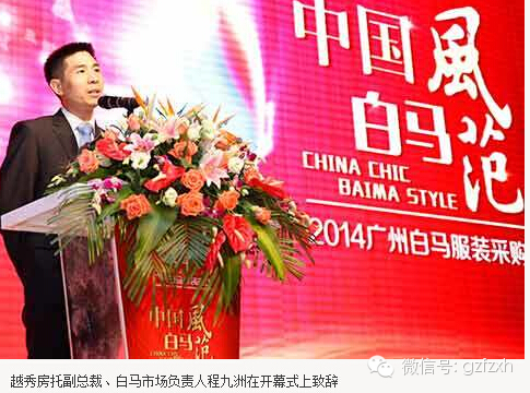 越秀房托副总裁、白马市场负责人程九洲、广州市经济贸易委员会杨勇副主任、中国纺织工业联合会副会长流通分会会长夏令敏先生,分别就白马推助原创品牌发展所做的措施、服装企业自主品牌在行业内的发展态势以及传统服装行业转型升级的重要意义等作出致辞,希望在白马的带动下,更多专业市场及服装品牌也能以全新思维积极探索和追求服装品牌的发展之路,全面推进我国自主服装品牌建设。