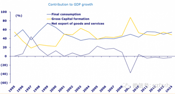 周三的统计数据也显示,中国的再平衡已然开始(见下图),消费支出对国内生产总值(GDP)增长的贡献率(54.4%)大于投资对GDP增长的贡献率(48.5%)。净出口对GDP增长的拖累为-2.9%。