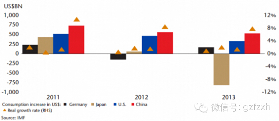 上半年的数据,建立在2011年以来消费表现强劲的基础上。自2011年以后,中国消费支出的年增量和增长百分比都高于美国、德国和日本(见下图)。