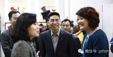 白马服装市场总经理程九洲(中)与广州市越秀区副区长陈伶俐(左)同参展品牌代表交流