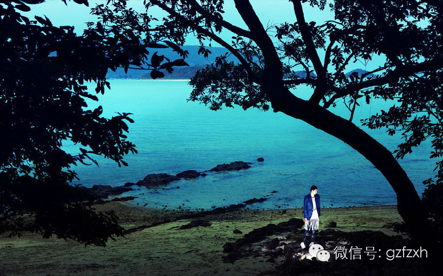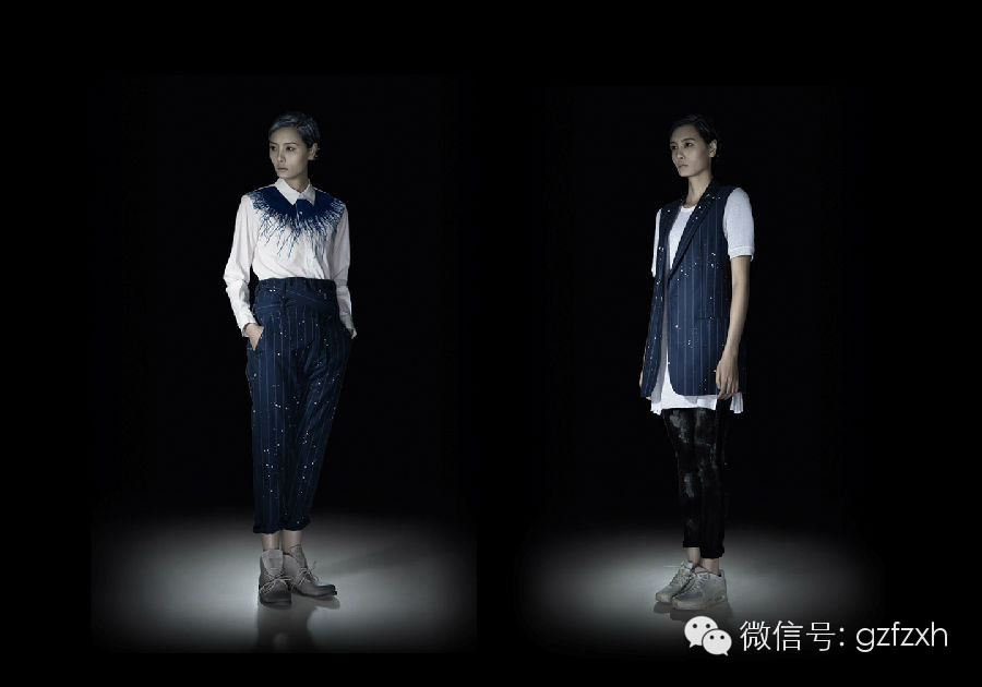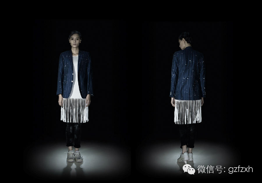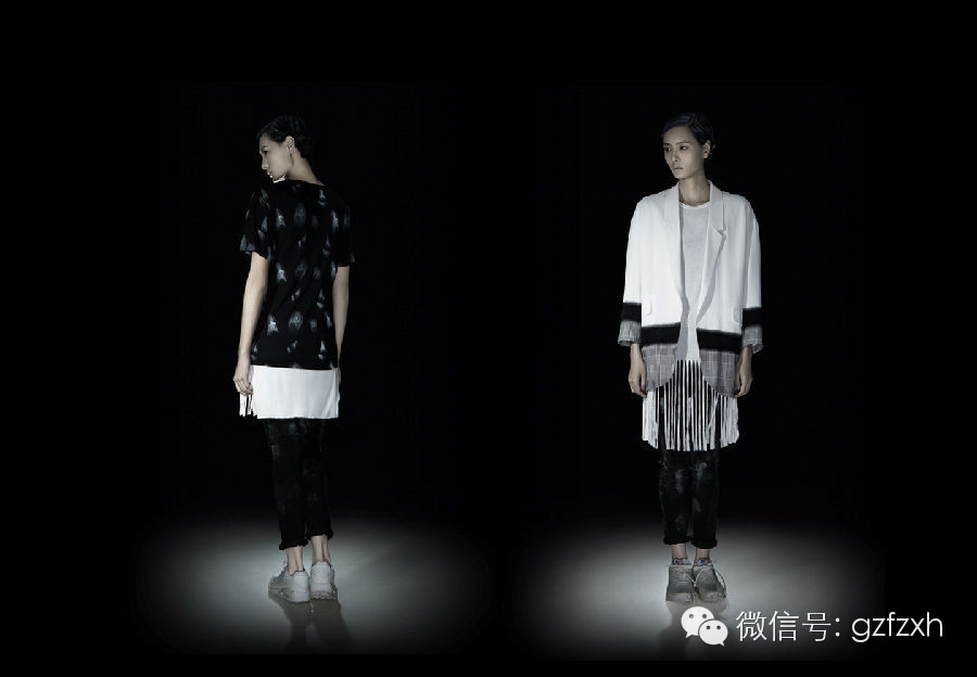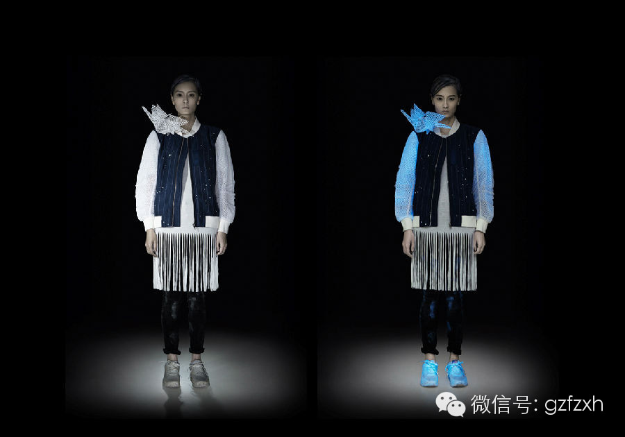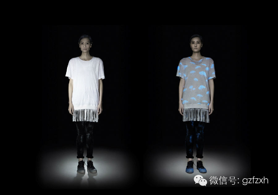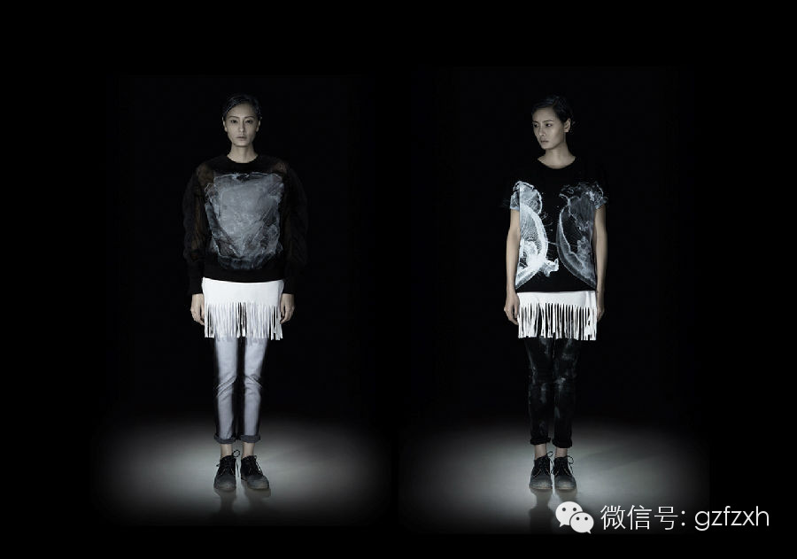 此系列设计以白色和蓝色为主色调,透为特点,采用真丝、丝麻和棉为主材料,更值得一提的是,使用了夜光印花、特殊夜光浆的纯手工上色、成品泼油和喷色、流苏设计、植绒等较为罕见的工艺于此系列的制作上,为更好地诠释水母特有的形态。