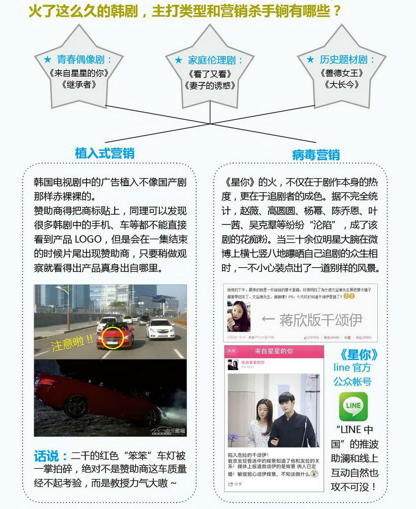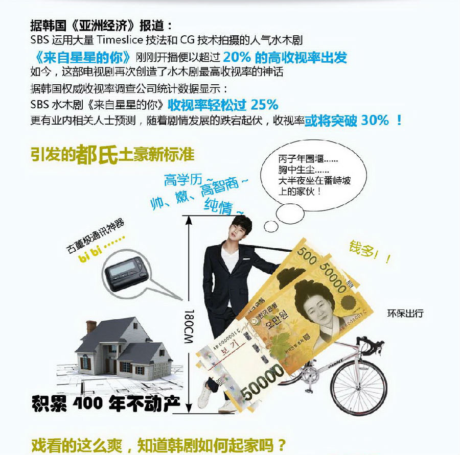 据韩国《亚洲经济》报道:SBS拍摄的人气水木剧《来自星星的你》再次创造了水木剧最高收视率的神话!有业内相关人士预测,随着剧情发展的跌宕起伏,收视率或将突破30%!神剧很给力,不仅戏看的爽,贯穿捆绑在剧中的广告也给剧情增色不少!而此剧也引出营销话题:整个韩剧市场是如何把自己变成媒介来为广告做营销的呢?
