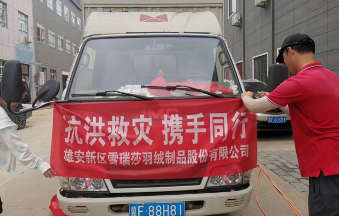 保定雪瑞莎羽绒制品股份有限公司积极响应河北省纺织与服装行业协会党支部的号召,在涿州遭受洪涝灾害、严重影响人民群众的生活和生命安全的第一时间,雪瑞莎集团勇于担当社会责任,紧急调配灾区居民生活日用物资,火速发往涿州,以解群众基本生活困难之急。