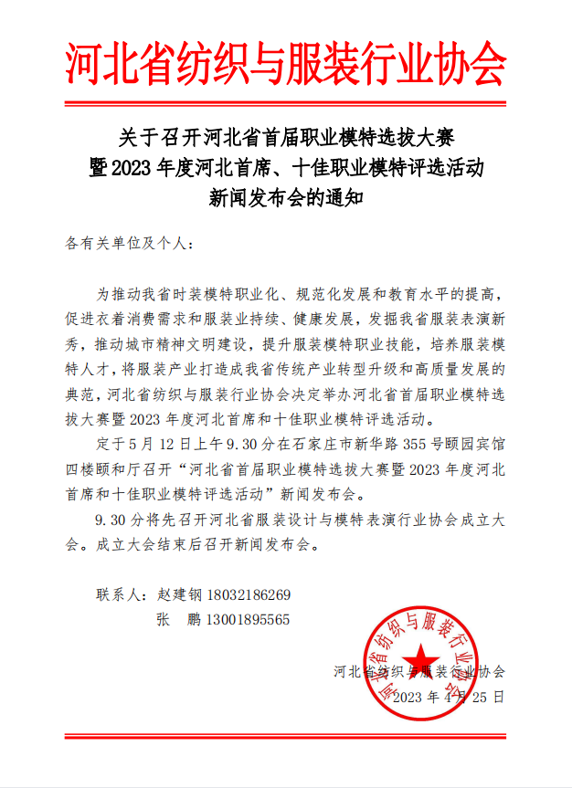 同期举办河北省首届职业模特选拔大赛暨 2023 年度河北首席、十佳职业模特评选活动新闻发布会,欢迎行业同仁前往参加,共襄盛举!