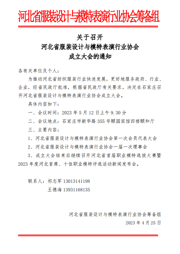 河北省服装设计与模特表演行业协会定于2023 年 5 月 12 日上午在颐园宾馆四楼召开成立大会。