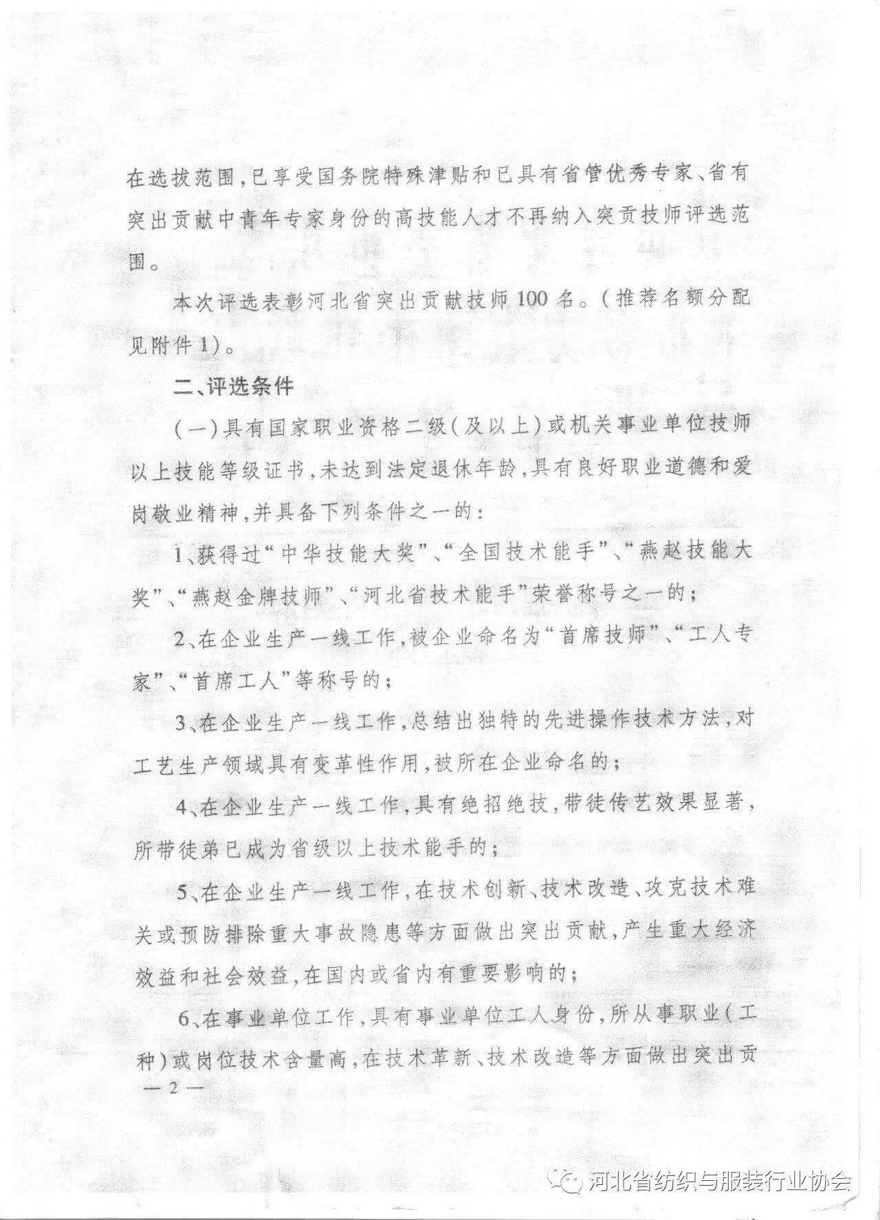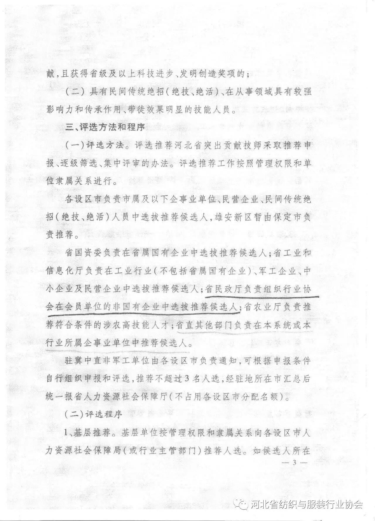 根据中共河北省委组织部、河北省人力资源和社会保障厅和河北省财政厅《关于开展河北省突出贡献技师评选表彰工作的通知》要求,省民政厅负责组织行业协会在会员单位的非国有企业中选拔推荐候选人。