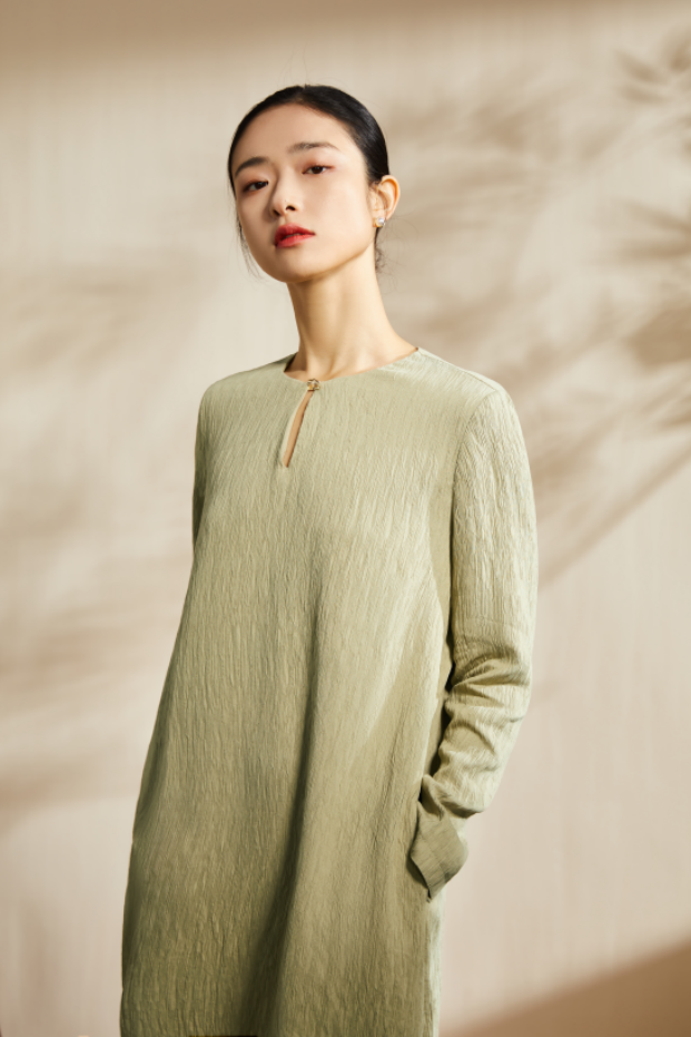 清新脱俗的米白凝脂与浅绿行香子,颇具中式风格的颜色,仿佛春天的气息萦绕在身边;宽松的剪裁结合垂顺的廓形,不仅穿着舒适自在,还能修饰身形曲线;领口独特的镂空设计,巧妙地展现出女性的柔美与风情,同时增添了一丝神秘感;面料触感顺滑细腻,轻盈飘逸,彰显了优雅高贵的女性气质。
