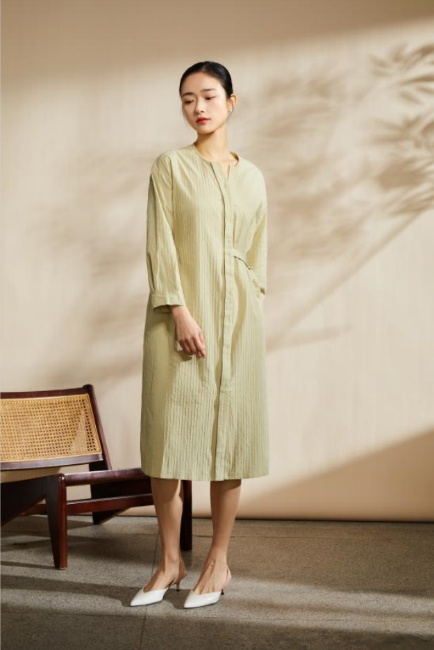 衬衫式连衣裙的设计,在版型上注重舒适与修身,在穿着中感受到无拘无束的自由。腰部的腰带装饰设计,是这款连衣裙的一大亮点,它不仅仅是一个装饰,更能勾勒出身材曲线,凸显出纤细腰线。别致的行香子浅绿色调,既显白又充满生机,轻松为春日造型增添一抹亮眼的色彩。