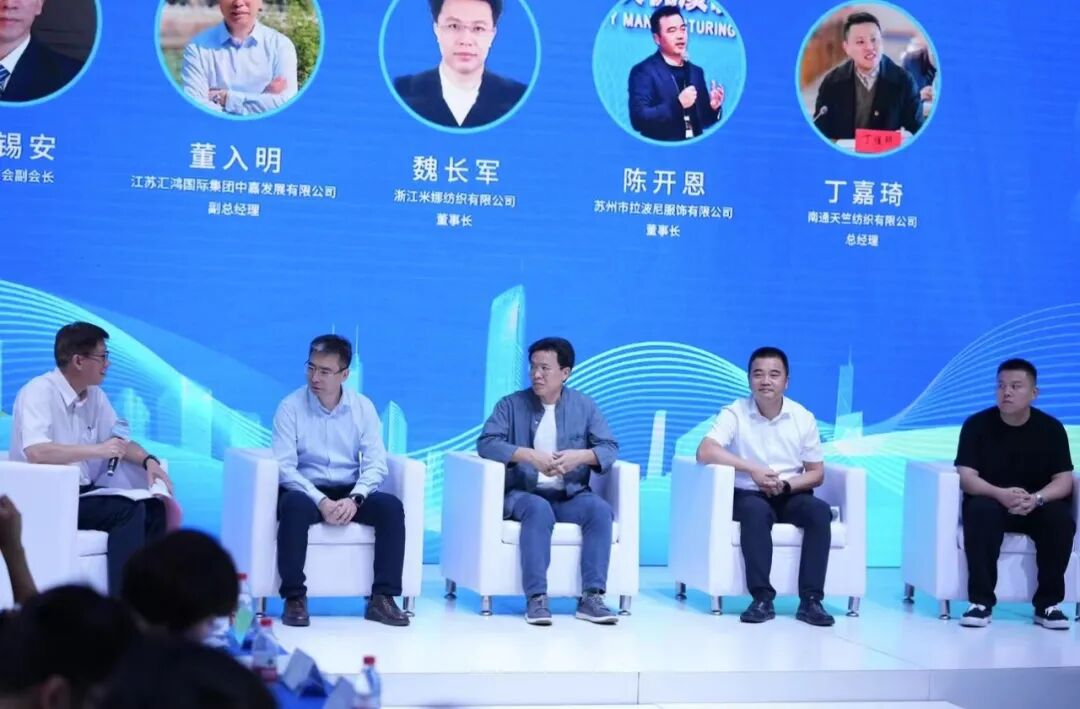 在纺织商会副会长张锡安的主持下,江苏汇鸿国际集团中嘉发展有限公司副总经理董入明、浙江米娜纺织有限公司董事长魏长军、苏州市拉波尼服饰有限公司董事长陈开恩和南通天竺纺织有限公司总经理丁嘉琦就“面对挑战,出口企业的转型之路”进行了精彩对话,就企业创新设计研发、数字化转型、全球化布局、绿色可持续发展及人才培养等方面进行了探讨,赢得与会企业代表的强烈共鸣。