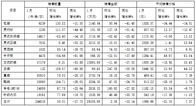 2023年1月份上海服装行业协会网络信息服装商品分类销售情况表