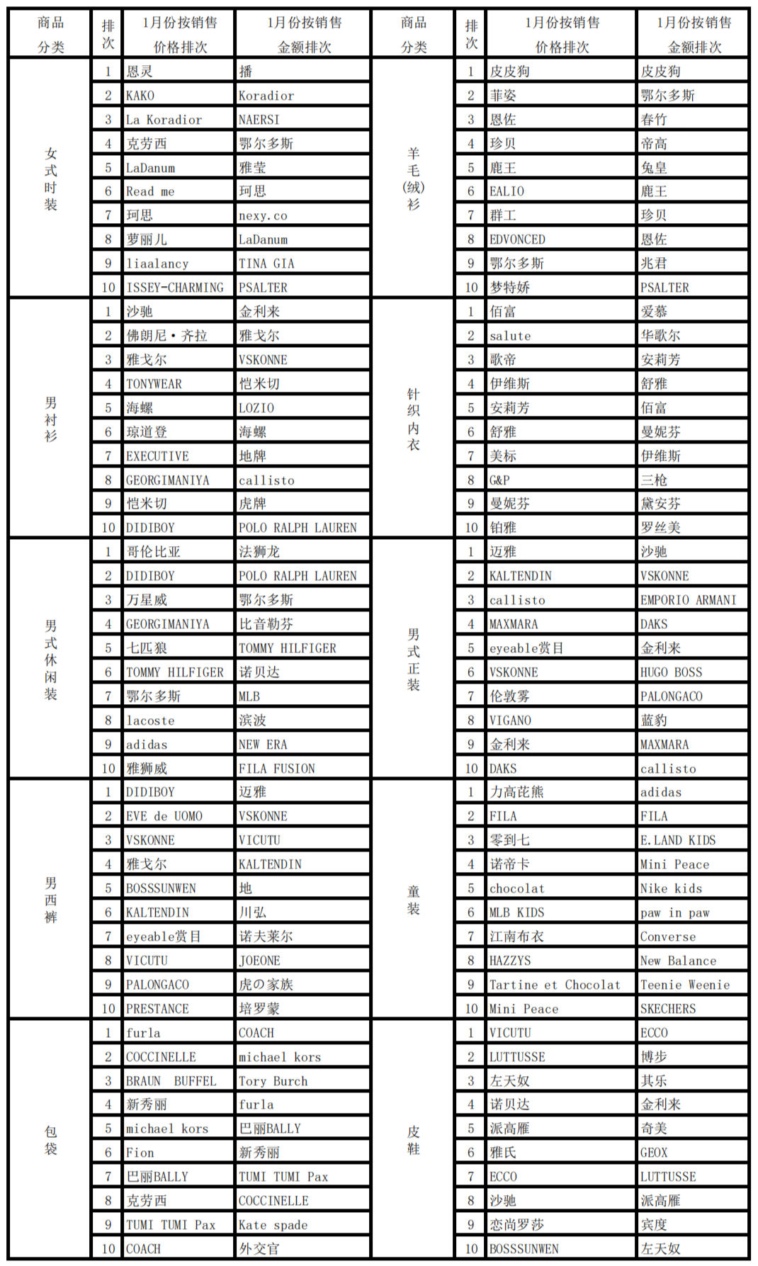2023年1月份上海服装行业协会网络信息服装商品销售品牌排行榜