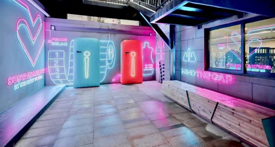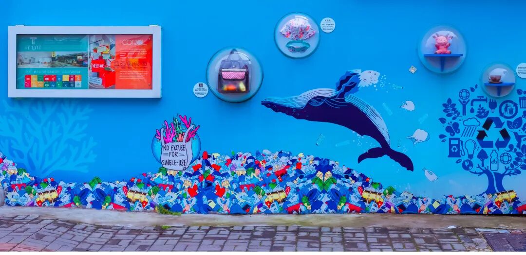 园区外立面通过描绘“海洋垃圾上的蓝鲸”,具象地使大众认识到环境保护的重要性,呼吁大众使用以环保材质为原材料所制而成的日常用品,包括广告布回收再造环保背包、可回收塑料瓶制成的衣物以及咖啡渣再造所成的咖啡杯,将“环保减塑”融入日常。