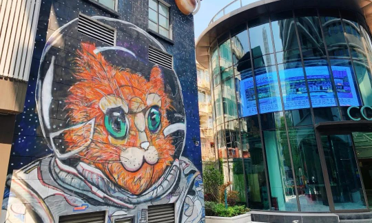 园区外立面绘制出遨游在星空中的猫咪形象,初建便已成为打卡圣地,吸引路人驻足拍照。