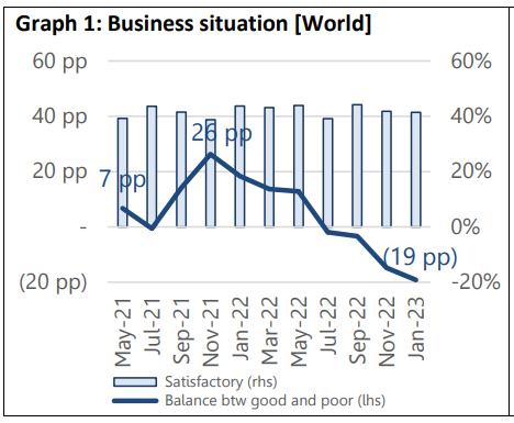 自从国际纺联于2021年开始全球纺织行业调查以来,商业形势处于新的低点。高通胀和利率上升是当前全球经济的主要驱动因素,但2023年纺织品供应链的核心问题是品牌高库存和零售水平。