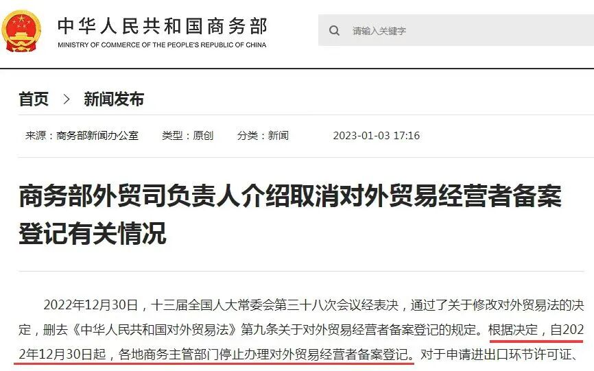 据1月3日商务部消息,2022年12月30日,十三届全国人大常委会第三十八次会议经表决,通过了关于修改对外贸易法的决定,删去《中华人民共和国对外贸易法》第九条关于对外贸易经营者备案登记的规定。