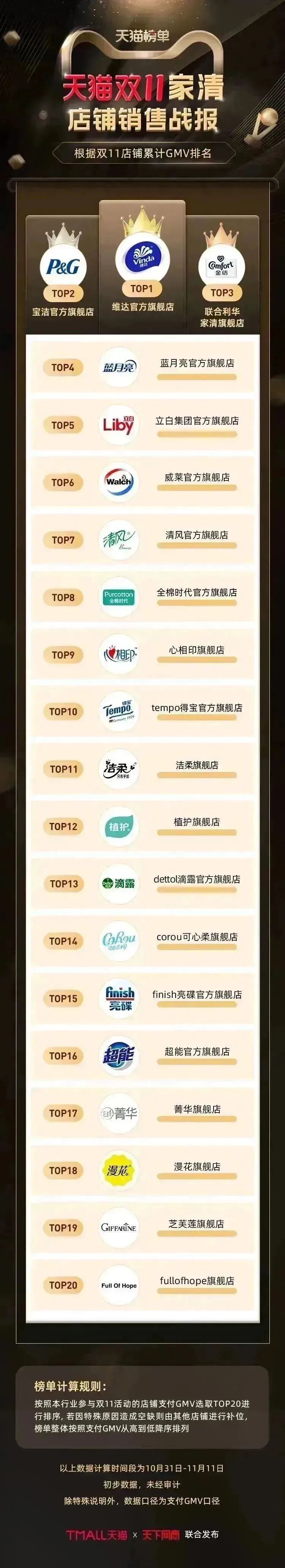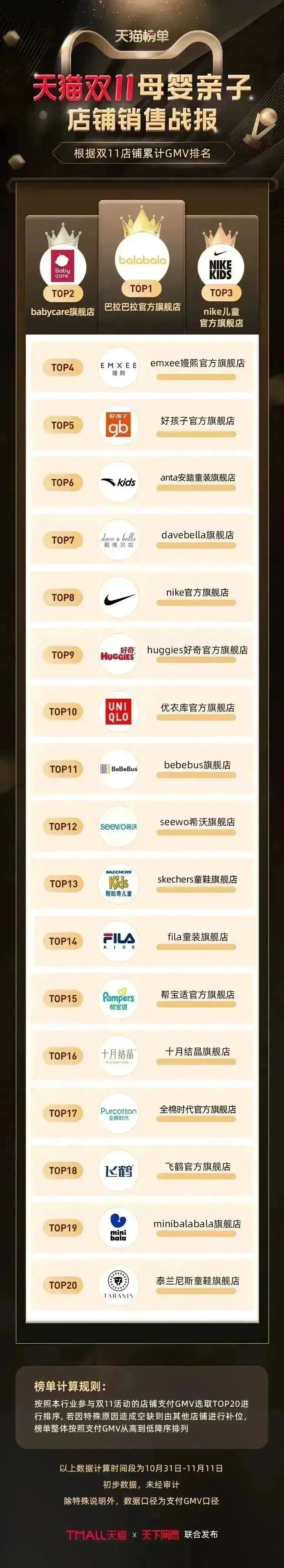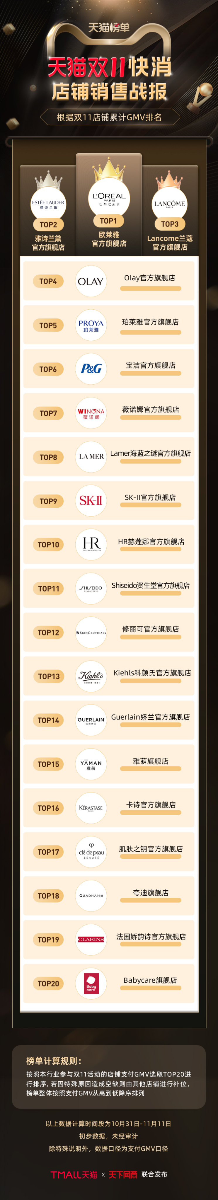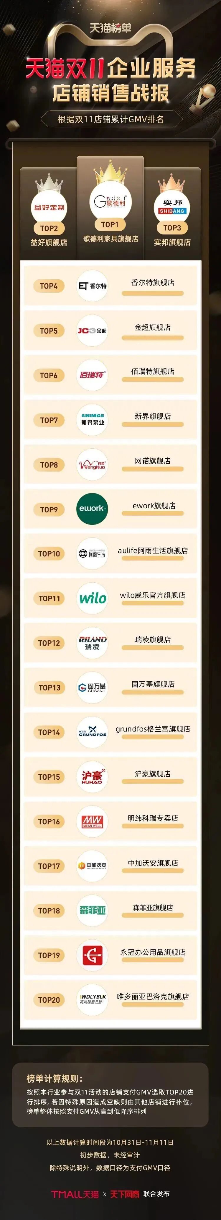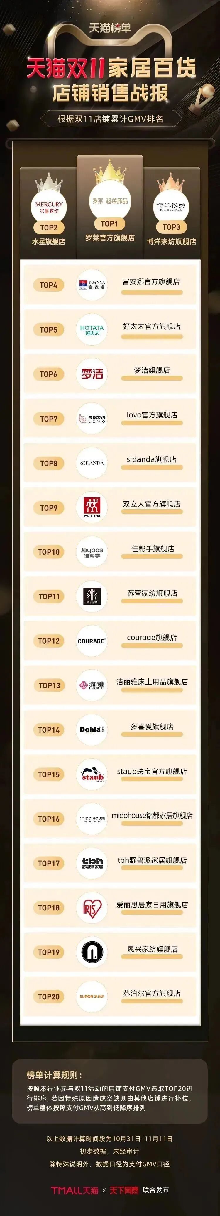 以下为《天下网商》联合天猫发布的2022年天猫双11(10月31日-11月11日)店铺/品牌销售额排行榜,感谢商家们全力以赴,期待来年再战。