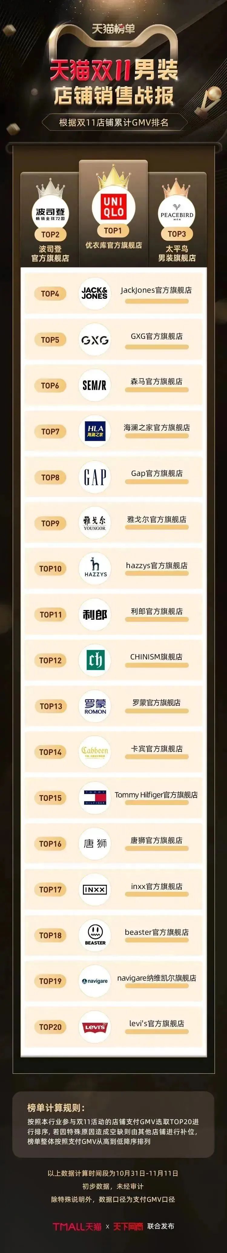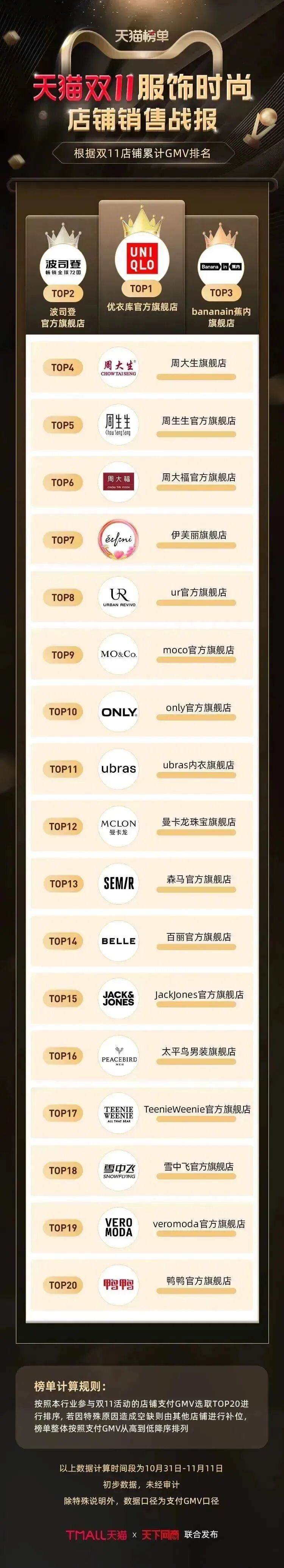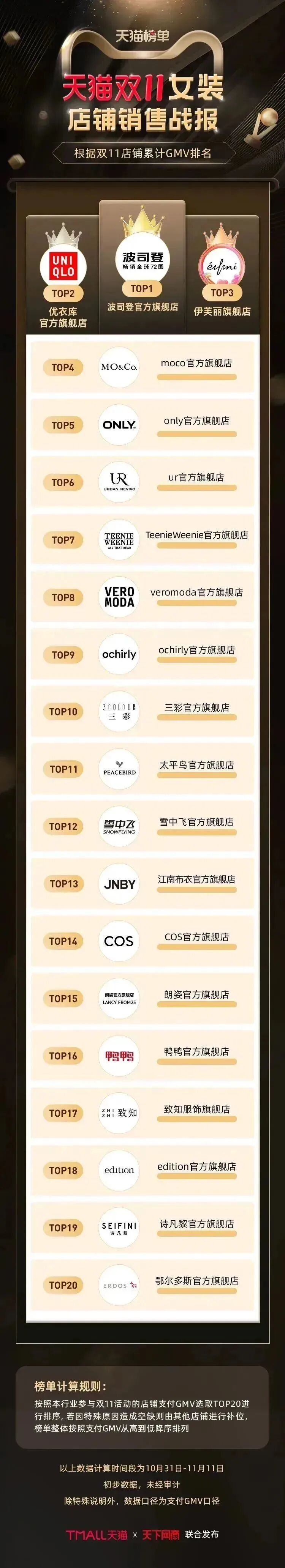 黑马跑出,新手迎来紧张又激动的“第一次”;老牌重燃,“老将”迎来突破自我的“又一次”。从第一年双11总成交额1800万,到今年10分钟破亿,波司登在天猫实现跨越式成长,位列今年天猫双11女装第一及男装第二。伊芙丽集团旗下女装麦檬今年首次实现天猫销售额破亿。