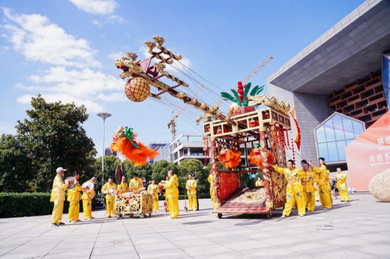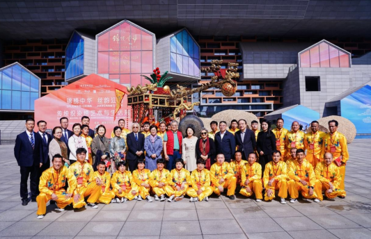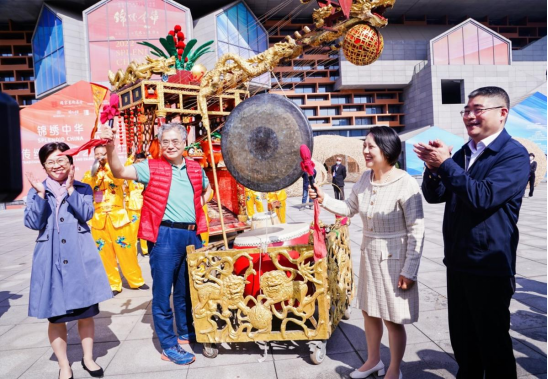 首展由国家非物质文化遗产展览展示研究中心、长三角生态绿色一体化发展示范区执委会支持,由北京服装学院主办,苏州市吴江区人民政府、中国传统工艺振兴计划协同创新中心、锦绣中华——非物质文化遗产展览展示系列活动组委会联合主办,中共苏州吴江区委宣传部、苏州市吴江区文体广电和旅游局、苏州市吴江区盛泽镇人民政府、《中华传统技艺》编辑部承办。开展仪式上,寓意“节日到、九狮跳”的国家级非遗代表性项目浙江永康“线狮(九狮图)”带来了妙趣横生的精彩表演,动的狮吞云吐雾、静的龙呼风唤雨,表达了风调雨顺、万家欢庆乐升平的美好祝愿。文化和旅游部原副部长项兆伦、长三角示范区执委会公共服务和社会发展部部长曹雪娟为展览鸣锣开幕,在苏州市委宣传部副部长、文明办主任杨芳,苏州市吴江区人民政府副区长孙俊良,苏州市文化广电和旅游局副局长曹俊,国家非遗展览展示研究中心专家委员会主任刘魁立,锦绣中华——非物质文化遗产展览展示系列活动专家委员会主任孙淮滨等嘉宾共同见证下,将开展仪式推向高潮!国家级非物质文化遗产代表性项目“线狮(九狮图)”现场展演文化和旅游部原副部长项兆伦(左二)、长三角示范区执委会公共服务和社会发展部部长曹雪娟(右二)为展览鸣锣开馆,苏州市委宣传部副部长、文明办主任 杨芳(左一),苏州市吴江区人民政府副区长孙俊良(右一)共同见证“锦绣中华 丝韵江南:传统织染绣艺术与生活展”开展仪式嘉宾合影所有嘉宾在本次展览项目负责人、北京服装学院副教授、中国传统工艺振兴计划协同创新中心副主任沈华菊的陪同下,穿过室外艺术装置“春蚕醒时、万物复苏”巨大蚕茧之间,以第一视角身临其境的感受茧室,也感受“一根丝”的来处;伴随着吴侬软语的评弹歌声《江南最美吴江隈》,嘉宾进入展馆,穿过序厅五彩斑斓的丝线装置“千丝万缕”,讲述江南“一根丝”的故事,以桑蚕吐丝,织就经纬,来比喻造物之极致,也由此引领进入展厅,串联起来自全国各地五彩斑斓的纺织印染刺绣项目,也代表着“锦绣中华:传统织染绣艺术与生活展”首展的正式启幕。