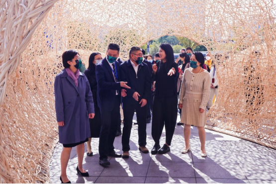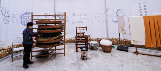 项目负责人、北京服装学院副教授、中国传统工艺振兴计划协同创新中心副主任沈华菊带领嘉宾穿过蚕茧装置本次展览重点选取全国各地具有代表性的织绣染类传统技艺项目50余项,邀请各地非遗代表性传承人60余位,以“天孙织锦——织造技艺”“铺锦列绣——刺绣技艺”“阑干斑布——印染技艺”为三大板块,链接不同城市的文化基因与生活美学进行集中展示,同时结合多位艺术家及设计师,打造独特审美特质的“生活艺术样板间”,探索传统文化回归当下生活的范式。
