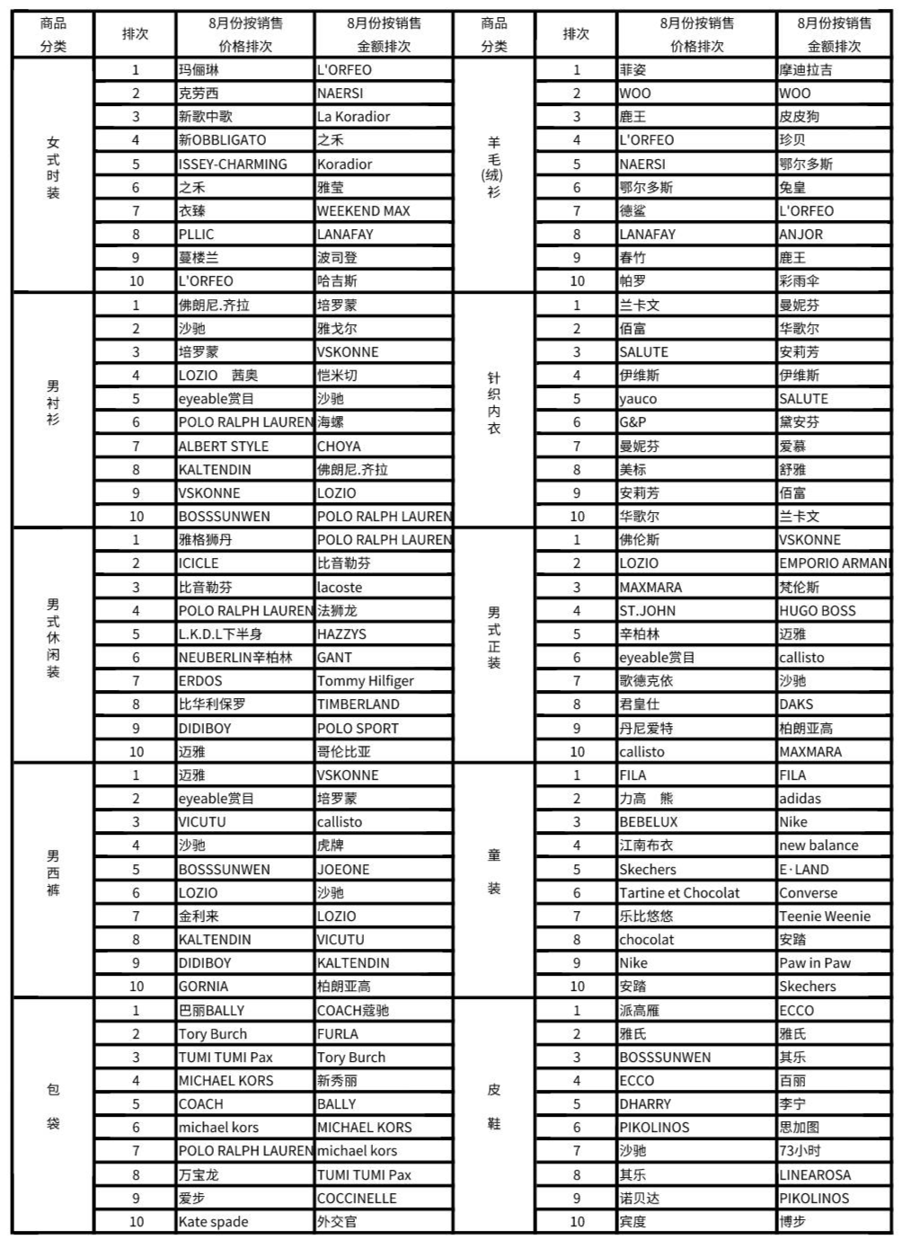 2022年8月上海服装行业协会网络信息服装商品销售品牌排行榜