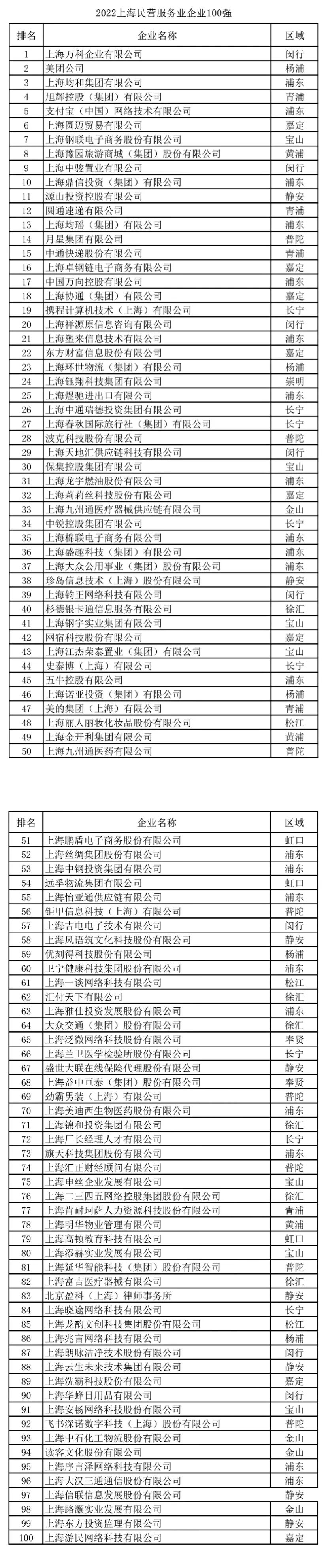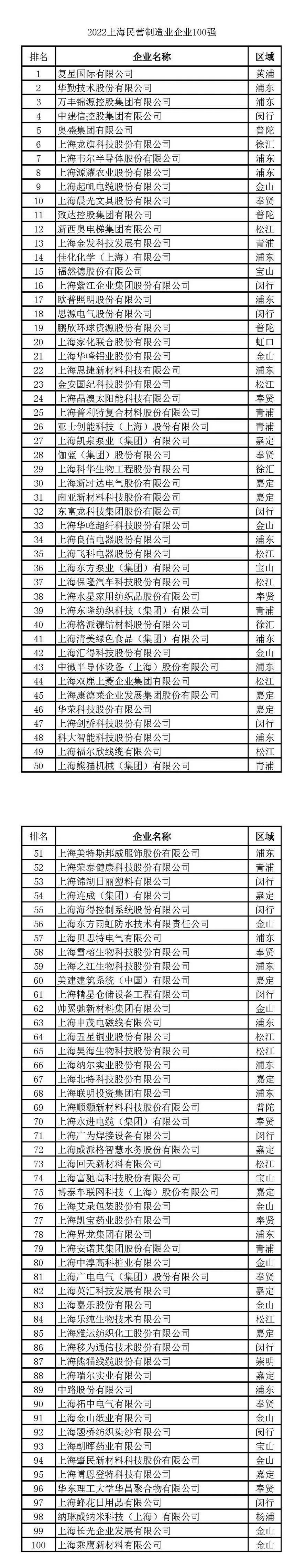 2022上海民营制造业企业100强 上海民营服务业企业100强