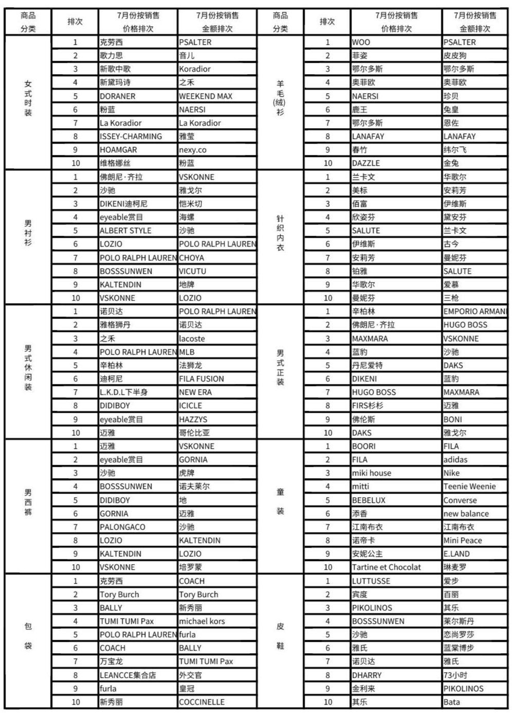 2022年7月份上海服装行业协会网络信息服装大类商品销售品牌排行榜