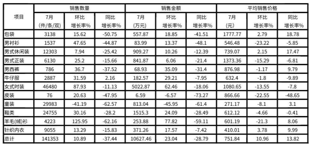 2022年7月份上海服装行业协会网络信息服装大类商品分类销售情况表