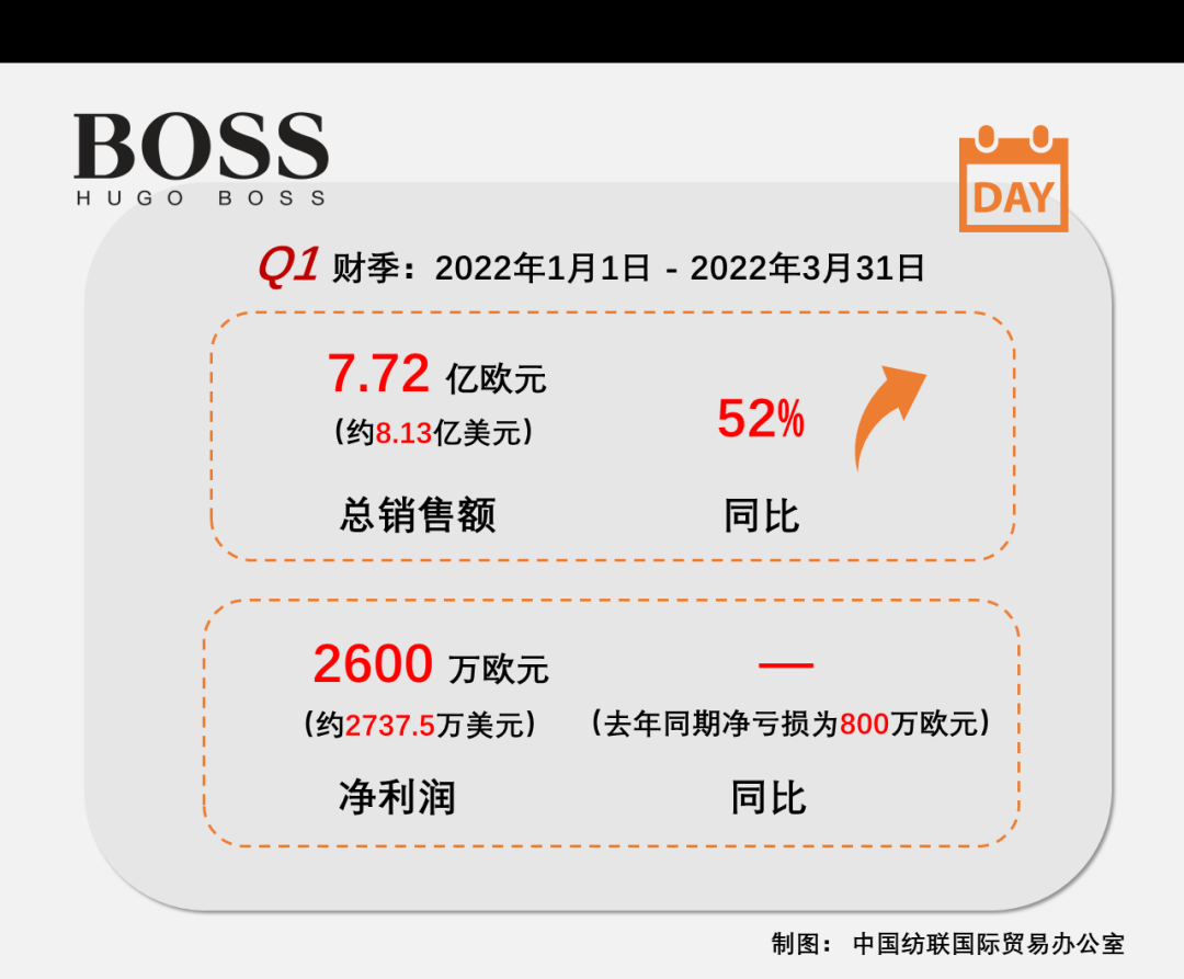 据德国高端时装集团雨果博斯(Hugo Boss)发布的最新财报显示,该集团截至3月底的2022财年一季度销售额为7.72亿欧元,同比增长52%,创财年一季度销售历史新高;净利润2600万欧元,表现明显优于去年同期水平(2021财年一季度亏损800万欧元)。