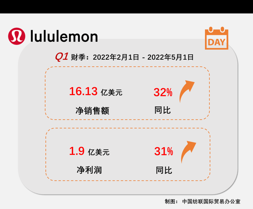 加拿大知名运动品牌露露柠檬(Lululemon)于近日发布2022财年第一季度业绩表现。一季度Lululemon净销售额为16.13亿美元,同比增长32%;净利润1.9亿美元,同比增长31%。