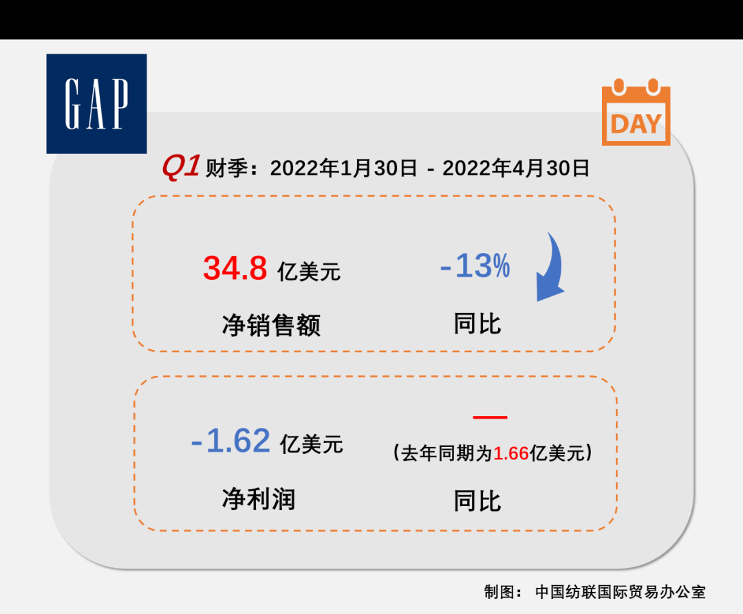 5月26日,美国快时尚品牌盖璞集团(GAP)发布了截至4月30日的2022财年第一季度财务业绩。财报显示,该季度GAP集团净销售额为34.8亿美元,同比下降13%;净亏损1.62亿美元,与去年同期1.66亿美元净利润差距较大。