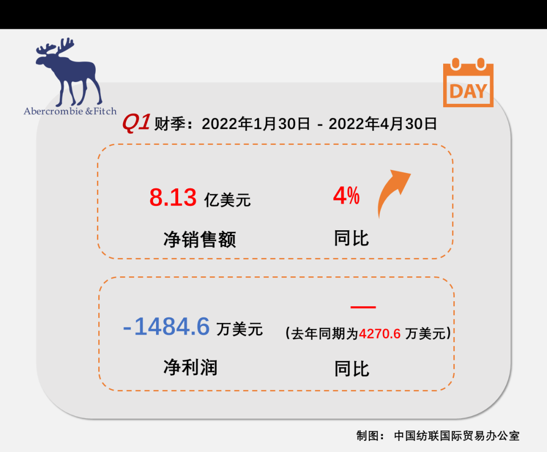美国百年休闲服装公司阿贝克隆比&费奇(Abercrombie & Fitch; A&F)近日发布最新一季财报,截至2022年4月30日,公司2022财年第一季度净销售额为8.13亿美元,同比增加4%,一季度营收水平创2014年以来同期新高;净亏损1484.6万美元,去年同期公司净利润则为4270.6万美元。