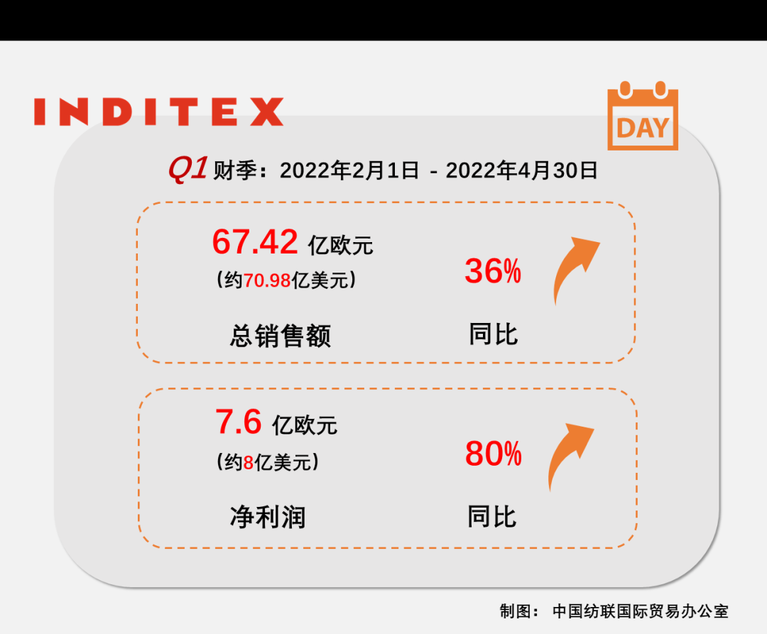 近日,Zara母公司、西班牙快时尚巨头盈迪德集团(Inditex)公布了2022财年第一季度的关键财务数据。该集团一季度销售额67.42亿欧元,同比增长36%,毛利率达到60.1%,为十年来最高水平;净利润同比大幅增长80%至7.6亿欧元。